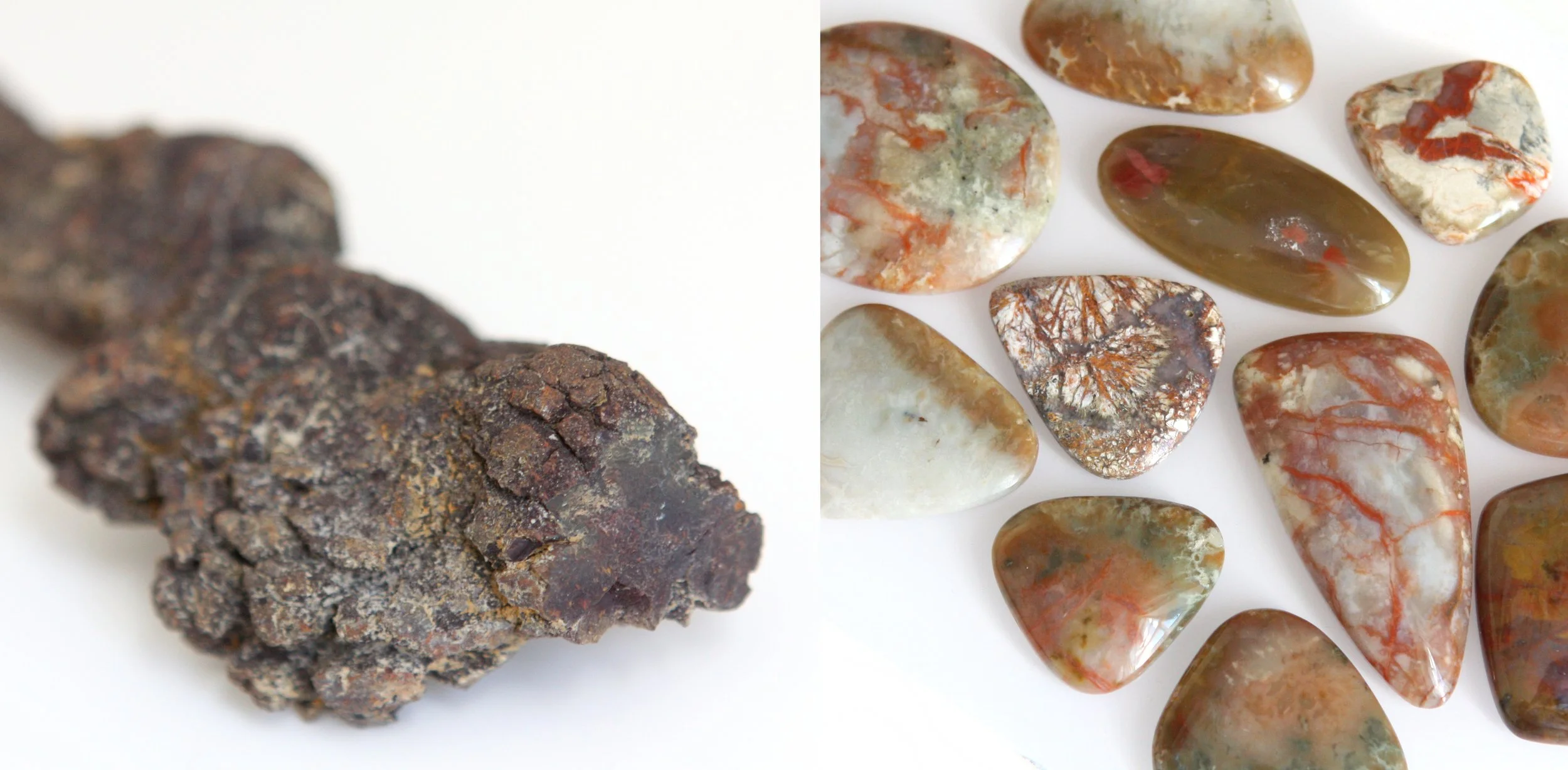 Here’s another question (or two) that I get a lot about coprolites - how did it end up so pretty and why do some look like actual turds and some look like gemstones? I get this about the fossil dinosaur bone I use in my jewelry as well and the answer is the same. It all depends on the conditions during fossilization. Once the original bone or poop has been buried, minerals will seep in from the surrounding groundwater and replace the organic matter with stone. If silica or other ‘pretty’ minerals are present in the groundwater and replace the organic material, you end up with nice colors and a fossil that is hard enough to take a nice polish. This is sometimes called an agatized fossil. If the not-so-pretty minerals do the replacing, you end up with the kind of dull, earth tone fossils that you typically associate with dinosaur bones. All fossils are beautiful and interesting, but humans just tend to prefer adorning themselves with shiny colorful things ;)